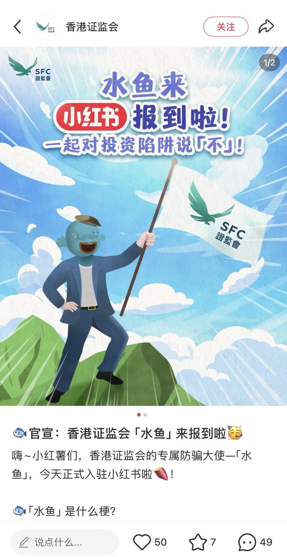 截至4月29日下午4点10分,香港证监会的小红书账号已发布两条内容,第一条为宣布香港证监会正式入驻小红书,第二条为官宣香港证监会的专属防骗大使“水鱼”。据该小红书笔记介绍:“在粤语里,‘水鱼’指的是容易上当受骗的冤大头,它总是抱着投机心理,幻想能一夜暴富,结果屡屡误信他人,深陷投资骗局,钱包受伤。”
